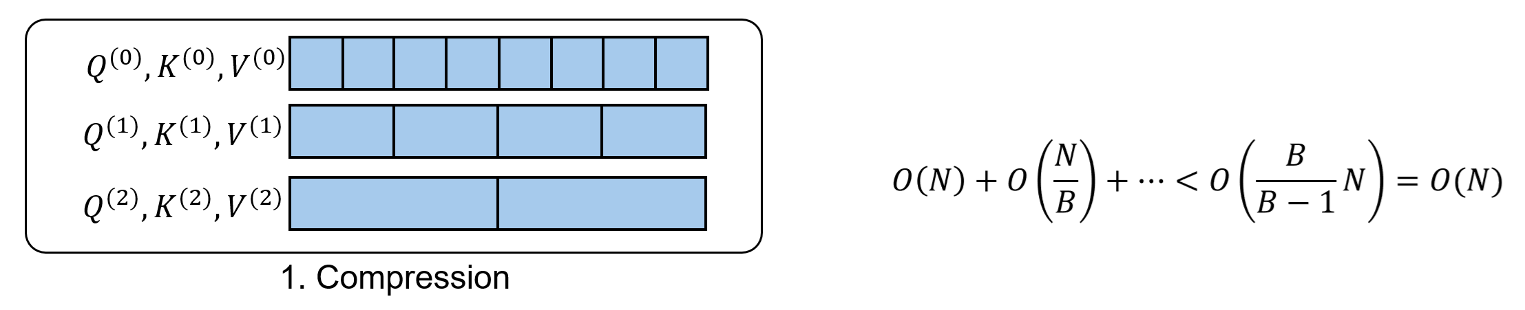 在层级压缩部分,只需要对总 token 数计数。不同层 token 数量构成一个等比数列,该数列的和小于一个与 $B$ 相关的常数乘以 $N$。所以复杂度是 $O(N)$。