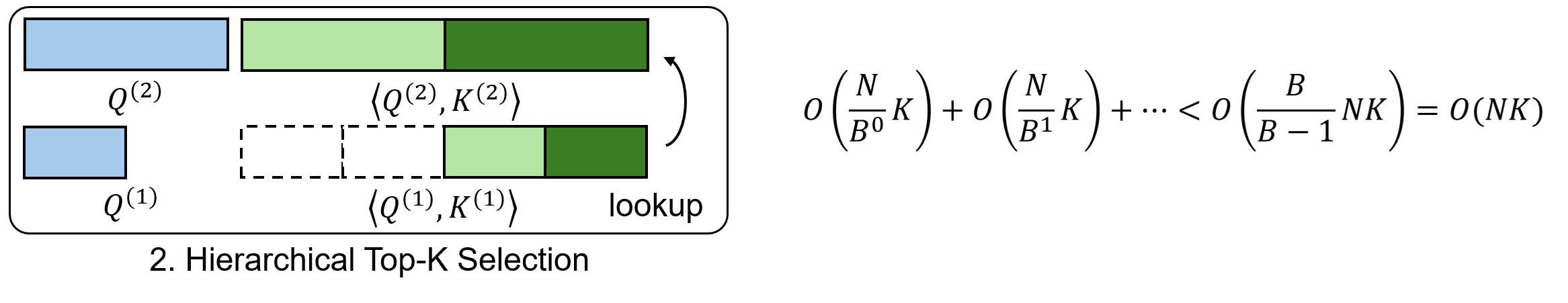 每个 query 在前一级里有 $K$ 个候选粗糙 key block。而到了这一级后,由于特征的精细度增加,每个 query 有 $KB$ 个候选 key block。对每个 query 的 $KB$ 个 key token,我们再执行 Top-$K$ 选择算法。算法递归执行,直到最底层。