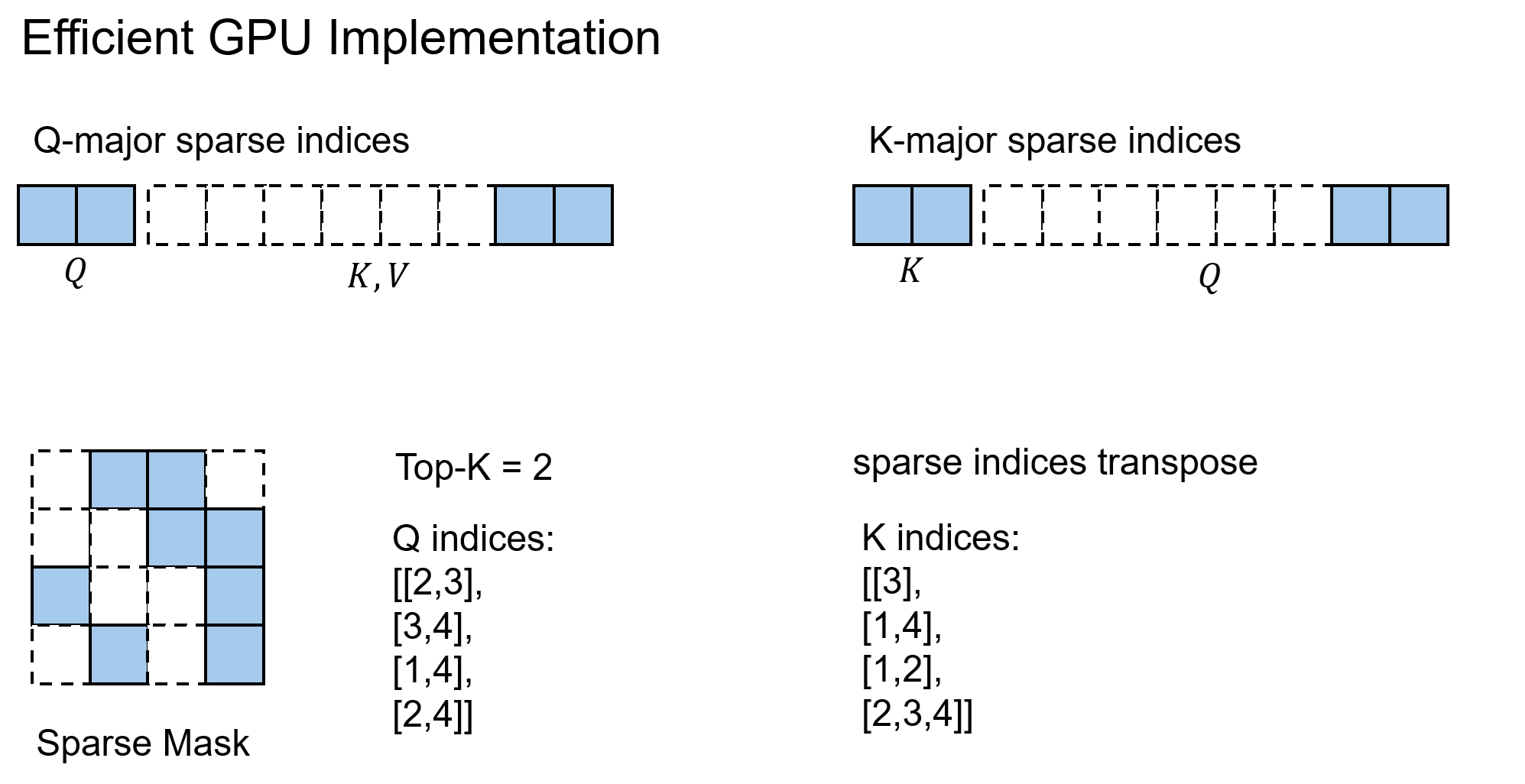 但在编程实现时,有一处难点:Top-$K$ 算法只能获取 Q-major 的稀疏索引(即哪些 Q 能看到哪些 K),但不能直接获得 K-major 的稀疏索引 (即哪些 K 能看到哪些 Q)。而在对 K, V 求梯度时,得用到 K-major 的稀疏索引,才能实现高效的求梯度算法。所以,我们要实现一套从 Q-major 索引到 K-major 索引的稀疏索引转置算法。