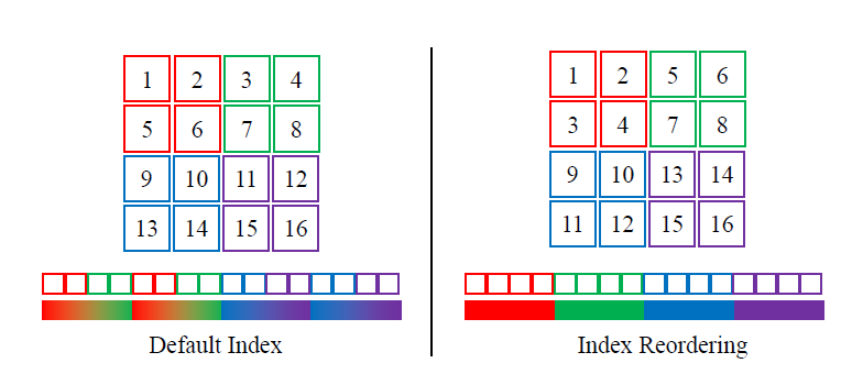 索引重排。LLSA 其实是为 1D 序列设计的。由于其中存在对相邻 $B$ 个 token 做平均下采样的操作,我们最好能保证相邻 token 的性质相似。而对于 2D 图像,最自然的做法是令 2D patch 的 1D 索引尽可能相邻。于是,我们参照之前的工作,设计了下面的索引重排方式。