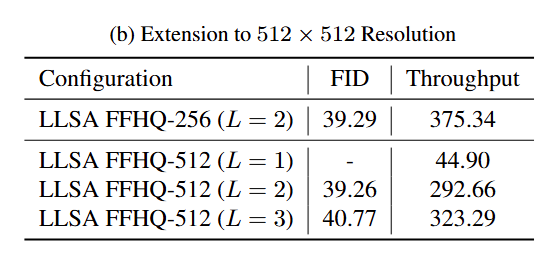 我们还尝试在 $512 \times 512$ 的 FFHQ 上训练 $L=3$ 的 LLSA。结果也完全符合预期:在序列变长时增加 $L$ 能使得模型速度几乎按 $O(N \log N)$ 增长,但因用到的 KV token 变少,效率提高,质量会稍差一点。