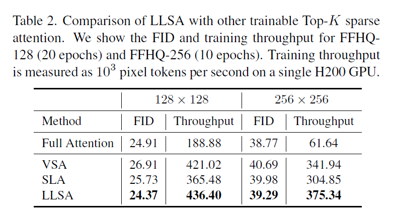 可以看出,哪怕是在实验配置较保守的情况下,无论是在 FFHQ 还是在 ImageNet 上,LLSA 都比之前的稀疏注意力又快又好。这个实验结果其实很正常。在设计注意力时,我尝试了很多处理粗糙 K, V 的方法。最后发现,如果像 VSA, SLA 一样引入多个计算 branch 再把结果相加,效果怎么都比不过只做一次注意力。可见,哪怕忽略 $O(\log N)$ 加速那一块,将池化后的 K, V 和原来的精细 K, V 一起做注意力的做法在生成质量上优于之前的处理方法。