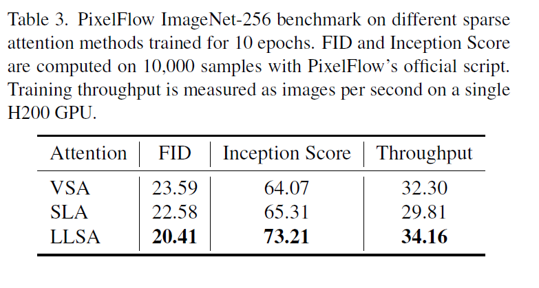 我们也尝试了 ImageNet-256 上的验证实验。为了在有限的时间内完成训练,我们以 patch size = 4 的 PixelFlow 为 DiT backbone,将其中的全注意力替换成 VSA, SLA, 或 LLSA。训练 10 个 epoch 后的结果如下。