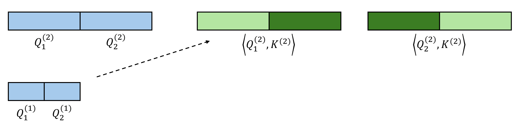 从第二粗糙级开始,我们递归地利用前一级的稀疏索引来再次选择 Top-$K$ token。这里,我们认为一个大 block 内所有精细 query 在这一级里拥有相同的 sparse pattern。比如下图中的 $\mathbf{Q}^{(1)}_1, \mathbf{Q}^{(1)}_2$ 都属于更粗糙的 $\mathbf{Q}^{(2)}_1$,它们应该只关注 $\mathbf{K}^{(2)}_2$ 对应的 key token。